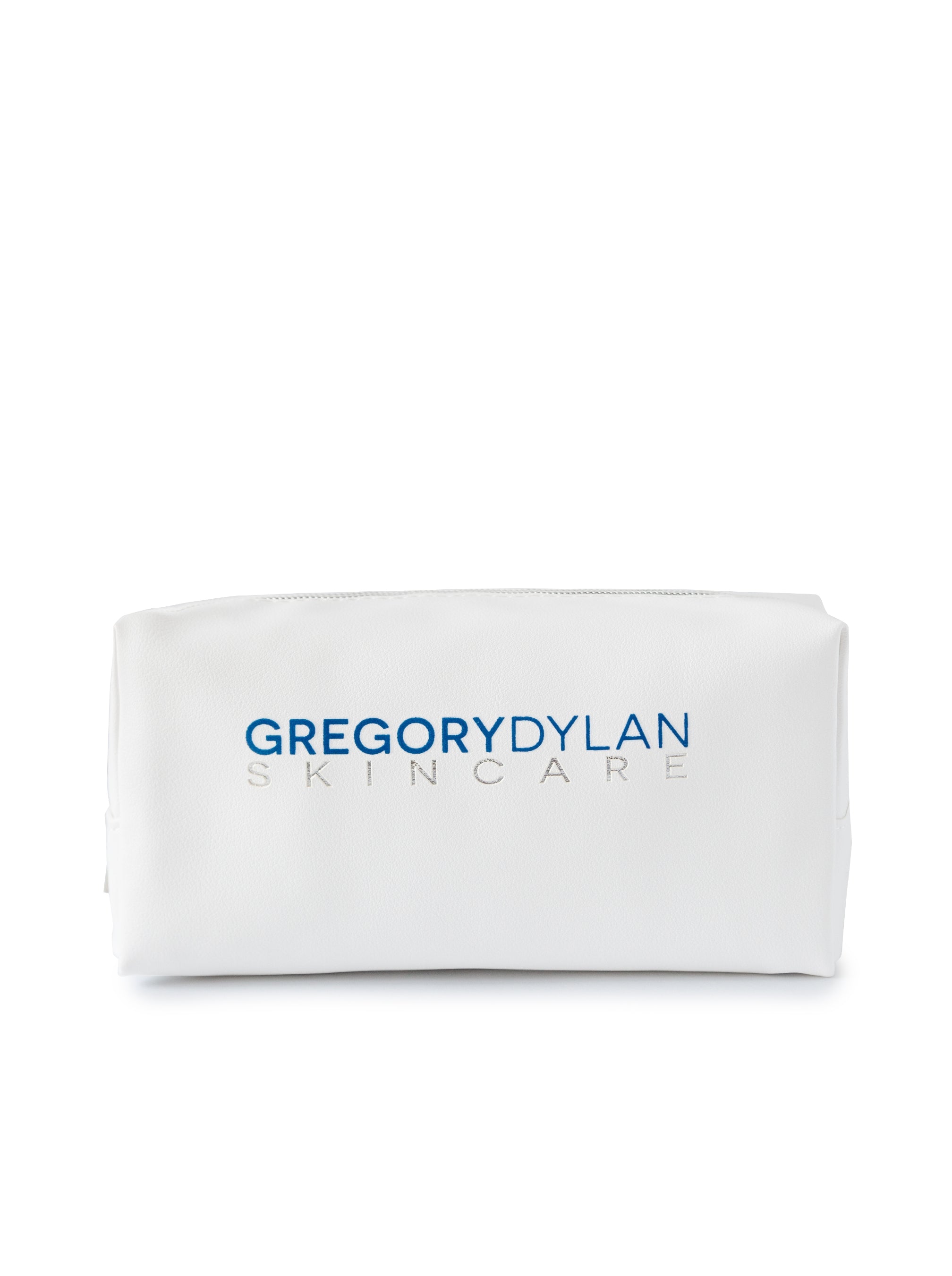 Take your glow on the go with this chic and roomy cosmetics bag! The white vegan leather exterior easily wipes clean and repels water while the roomy lined interior holds all your must-haves. Embossed with the Gregory Dylan Skincare logo in blue and metallic silver with silver zipper pull accent. Measures 8” x 4” x 4”.